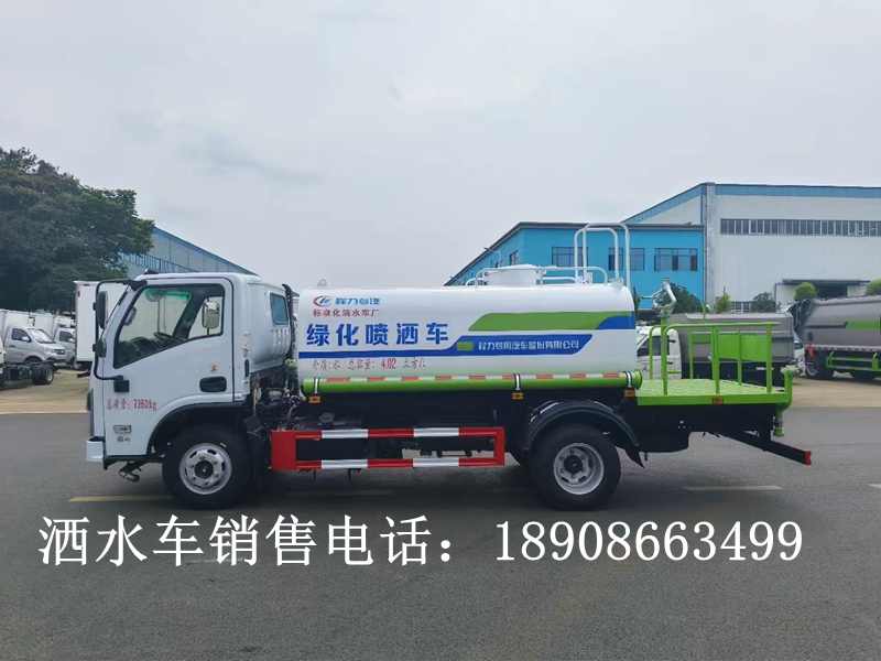 罐體有效容積按國標生產:橢圓形罐實際容積為5立方。灑水罐采用優質碳鋼制作。前沖,后灑,側噴,右側花灑,罐體后帶工作平臺,平臺上安裝綠化灑水炮,灑水炮可全方位旋轉,可連續調成直沖狀、大雨、小雨、毛毛雨,帶安全護欄,配備大功率專用灑水泵,泵可自吸自排,安裝過濾網,帶消防栓接口,可通過消防栓進水,帶自流口。
