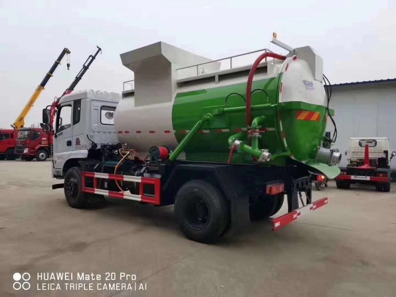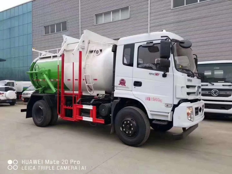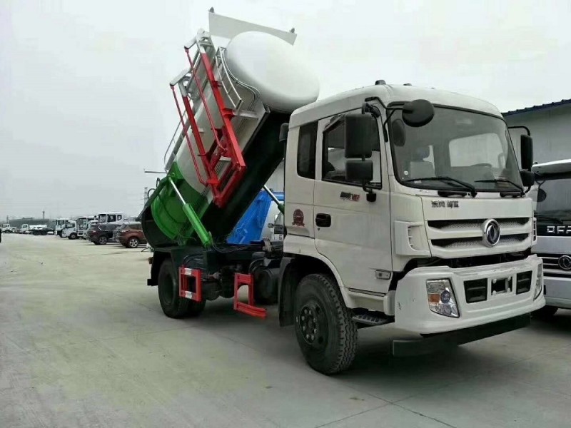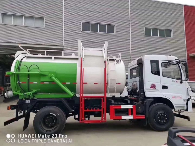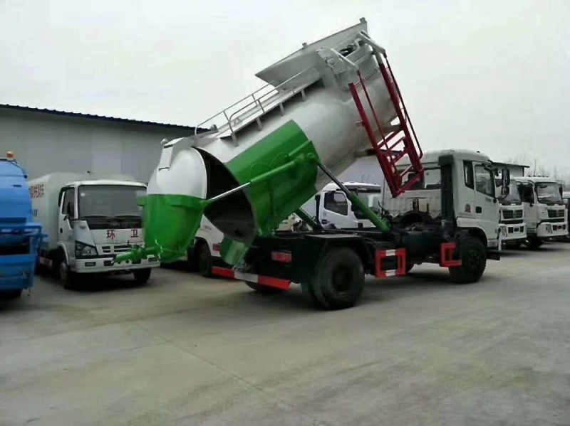 圓形碳鋼罐體,罐體厚度5mm,拉桿提升機帶上蓋聯動;后蓋液壓開啟;罐體舉升自卸。選裝內軒推鏟卸料,帶渣液分離功能。餐廚垃圾車可分罐式和廂式。